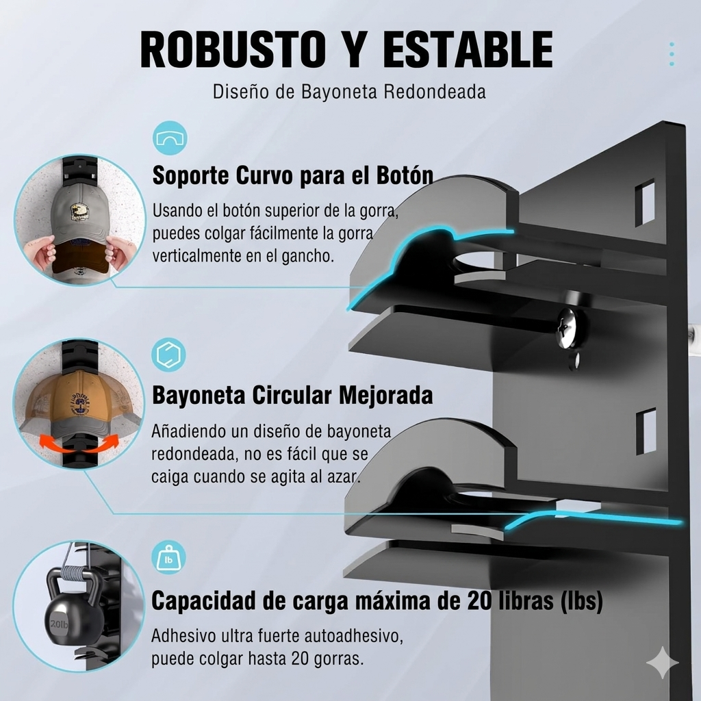 • Capacidad: hasta 10 gorras en un solo soporte
